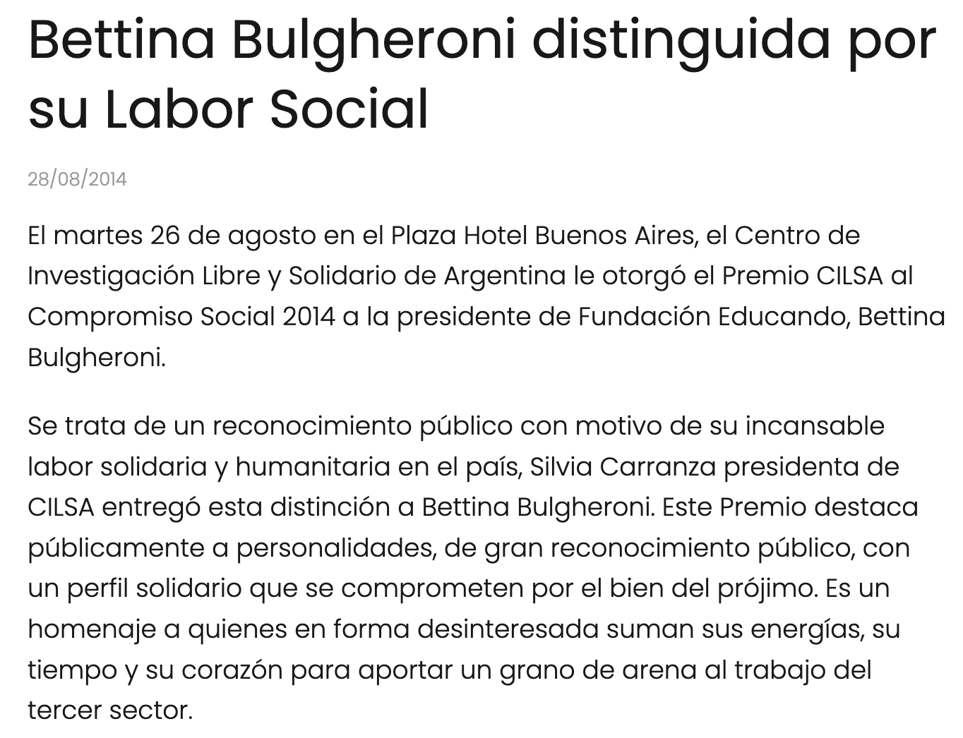 El Centro de Investigación Libre y Solidario de Argentina le otorgó el Premio CILSA al Compromiso Social 2014 a la presidente de Fundación Educando, Bettina Bulgheroni.